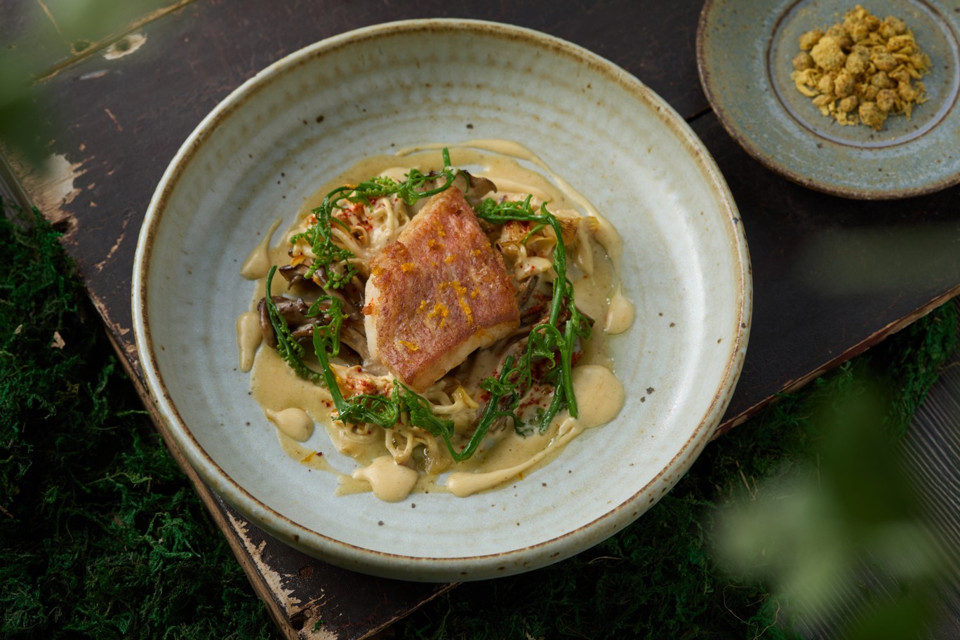 把石狗公煎得外酥內嫩,輔以珊瑚菇、舞菇、飛水過貓享用,創造酥、嫩、綿、滑不同口感,佐搭大花咸豐花醬及一旁的甜花茶,以味蕾編織豐盛甜美。
