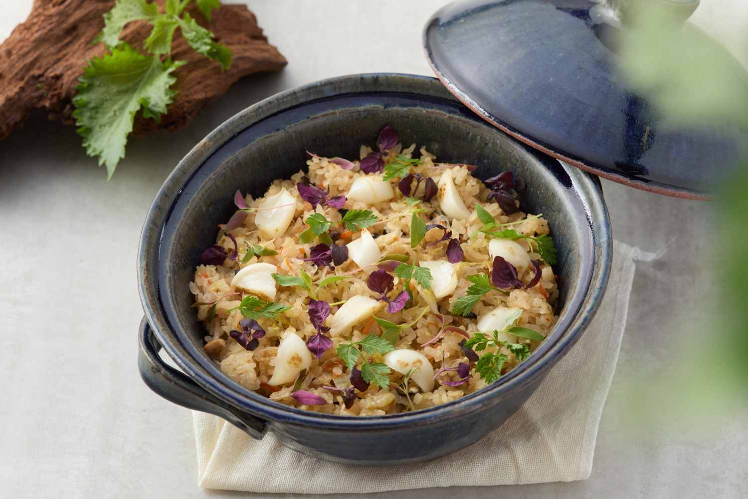 以山月夜草本茶細心炊煮,每一粒米都吸飽了山野的芬芳(魚腥草、白鶴靈芝、紫蘇、陳皮……),香菇丁與金鉤蝦交織出山海鮮美,蔬菜絲增添色彩,熱飯入口,配上酥香的豬梅花、紫蘇梅果醬。>華人餐桌上,不可缺少的一鍋,熱騰騰米飯是家的溫度,安心的象徵。