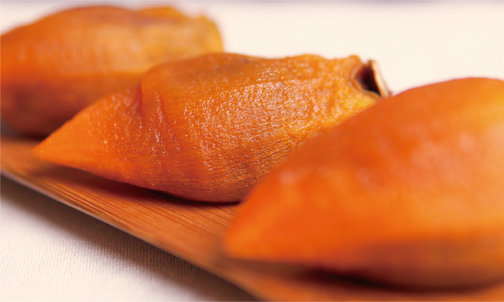 The One食藝團隊發想的「柿餅蛋黃酥」,精選彈牙厚實的筆柿取代一般外層酥皮,包裹著低糖的巧克力豆沙餡與鹹蛋黃,切面如圓月和月暈般。