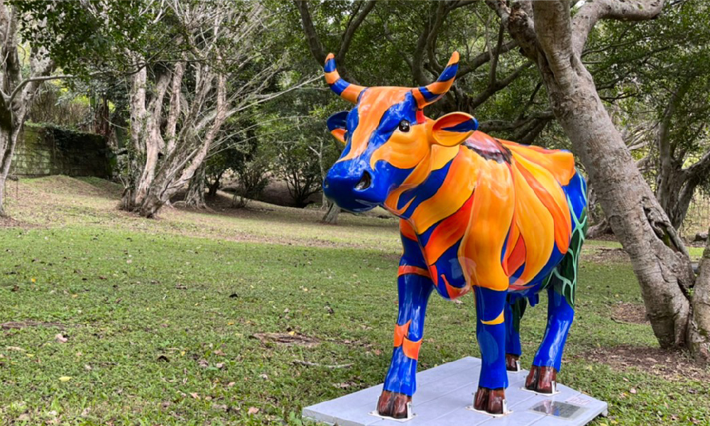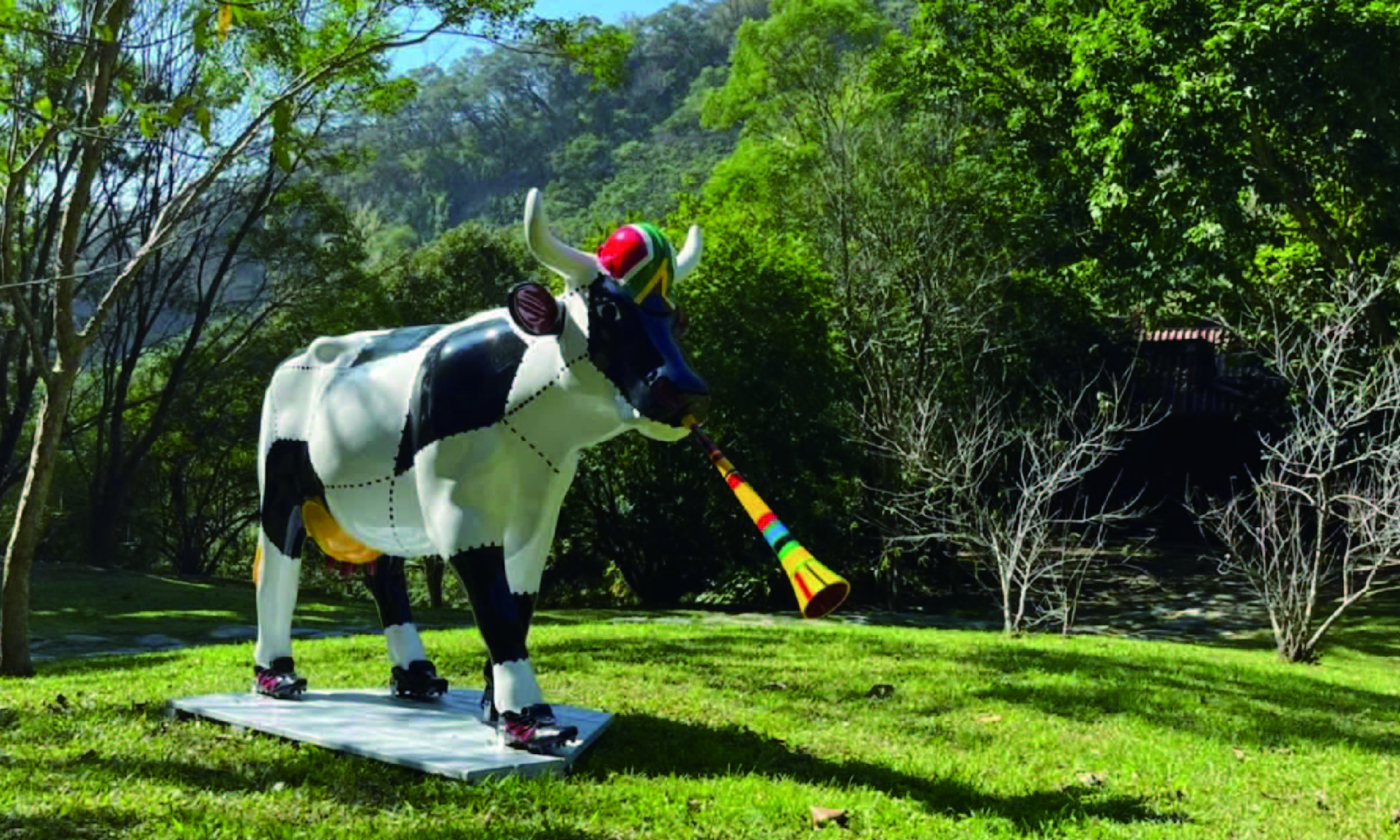 一身足球的黑白紋樣,帶著南非國旗帽子,和其他赤腳的牛隻相比,「氣勢牛」(Mooomentum)竟還穿上了球鞋,口中啣著南非樂器巫巫茲拉(Vuvuzela),不禁讓人馬上聯想到2010年在南非舉辦的世界盃足球賽。