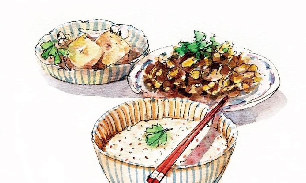 晨起,熬煮穀物粥,加兩片月桂葉(Bay)。香煎豆腐一碟搭配自製鹽麴,炒一碟滑蛋雨來菇。