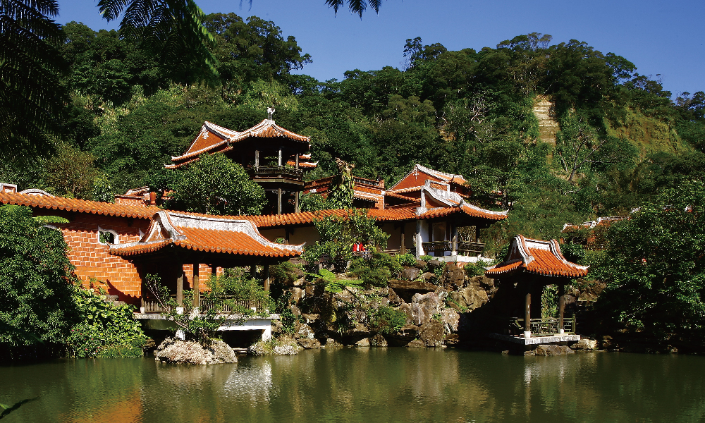 「四望疑仙,珠闕、瑤台、群玉。一塵不染,虹橋、鏡水、迴欄。」張佛千先生為「快覽亭」撰寫此聯。