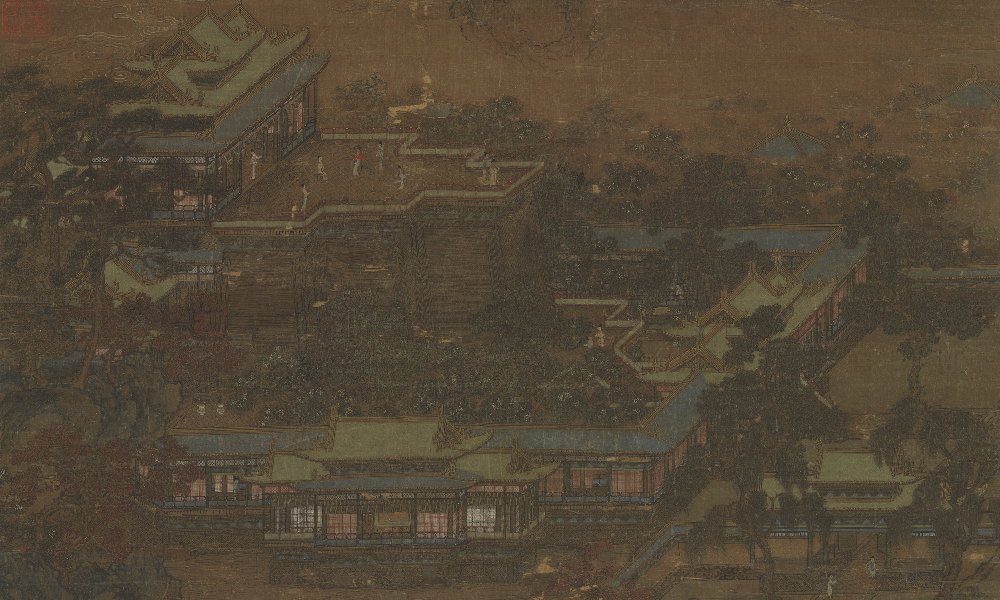 趙伯駒的《阿閣圖》(現藏台北故宮)內,遠山層巒疊嶂、有煙雲疏聚,殿閣三重,建築精巧宏偉,宮女舞蹈其中,一旁雜植各式樹木花卉,受無邊綠意環繞,眼前一幅景致天上人間。