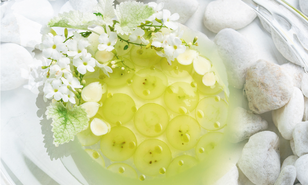 炎熱的氣候,甜點要讓人感覺爽口清新,Chef Makito Hiratsuka靈光乍現而有了哈密瓜、葡萄與杏仁的組合 。