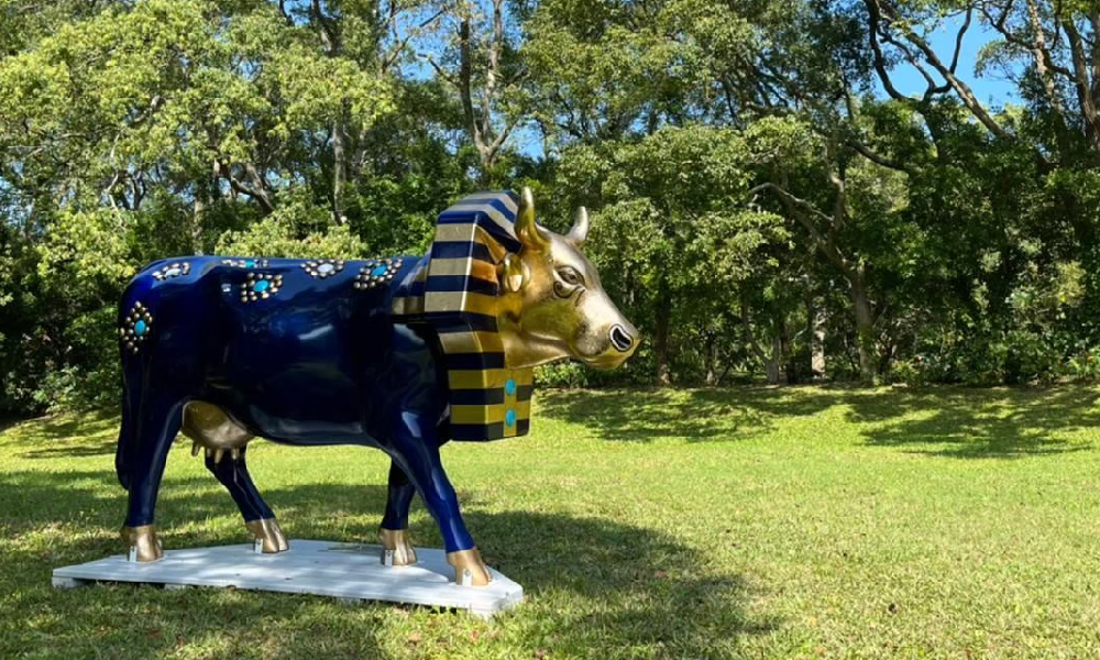 在大太陽下發光似的,閃耀著天藍色珠光的冰棒牛(Melted Cow)在The One南園同心樓前方草地上,與蒼穹相輝映,看著牛頭栽在地面上化開的模樣,彷彿都能感受到溽暑的高溫濕熱。